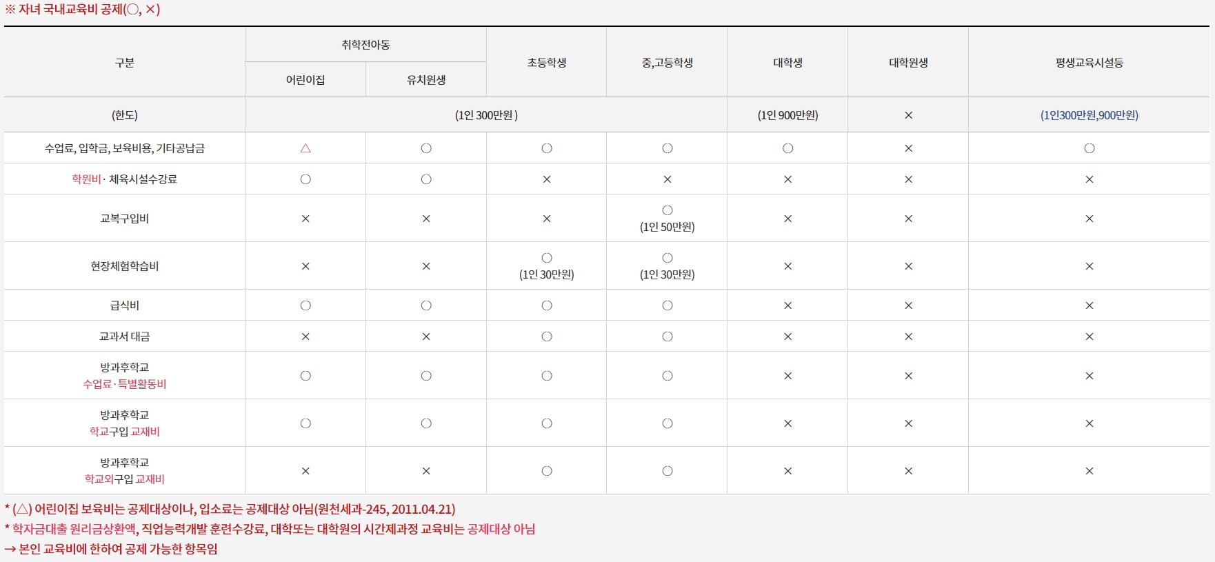 * 국외소재 어린이집비용 및 취학전 아동 학원수강료등은 공제 안됨