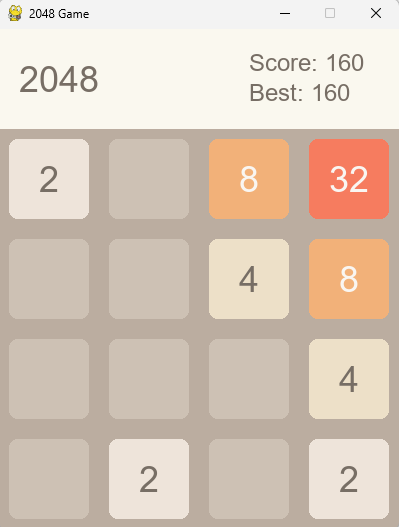 - 상단에는 게임 제목(2048)과 현재 점수 및 최고 점수가 표시됩니다.