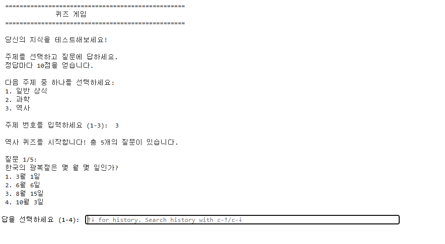 파이썬으로 시작하는 게임 개발의 세계 🐍🎮안녕하세요! Python Game Dev 블로그의 두 번째 포스팅입니다. 지난번에는 숫자 맞추기 게임을 만들어보았는데요, 오늘은 조금 더 복잡하고 재미있는 퀴즈 게임을 만들어보겠습니다.오늘의 게임: 퀴즈 게임 🧠퀴즈 게임은 사용자에게 다양한 주제의 질문을 제시하고, 정답을 맞추는 게임입니다. 이번 게임에서는 다양한 파이썬 개념들을 활용하여 조금 더 구조화된 프로그램을 만들어볼 예정입니다.게임의 규칙 📜게임이 시작되면 플레이어에게 여러 주제 중 하나를 선택하도록 합니다.선택한 주제에 관련된 여러 질문이 순서대로 표시됩니다.각 질문마다 보기가 제시되고, 플레이어는 정답이라고 생각하는 보기의 번호를 입력합니다.모든 질문에 답하면 최종 점수가 표시됩니다.게임이 끝..